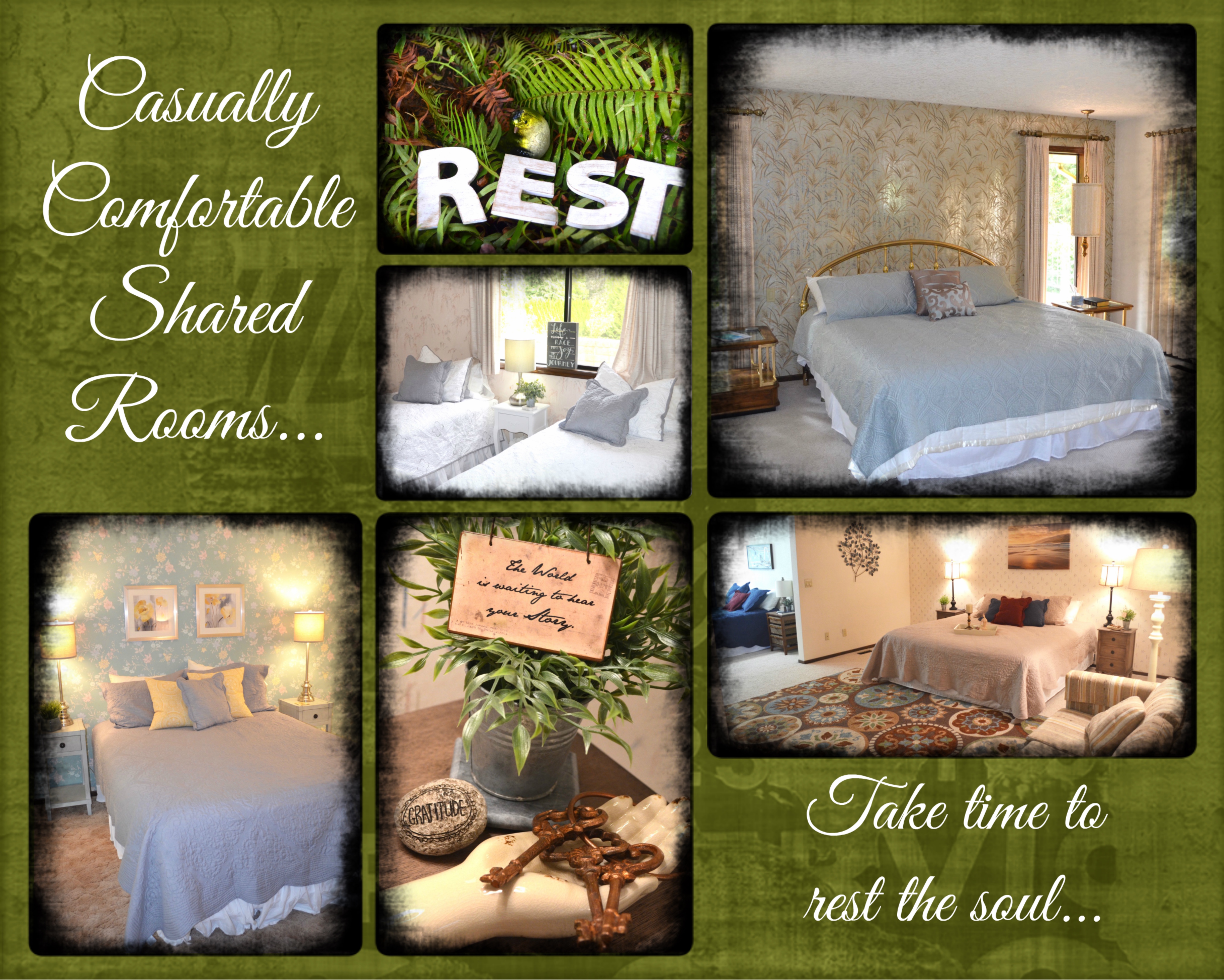 Each guest will be cared for with casually comfortable spaces for sacred rest in shared accommodations! The beds are a combination of king, queen, twins, memory foam sofa beds and high quality air beds. If you are coming with a friend, please let us know as the two king size beds will be offered to those who are comfortable sharing in order to best utilize the space!
