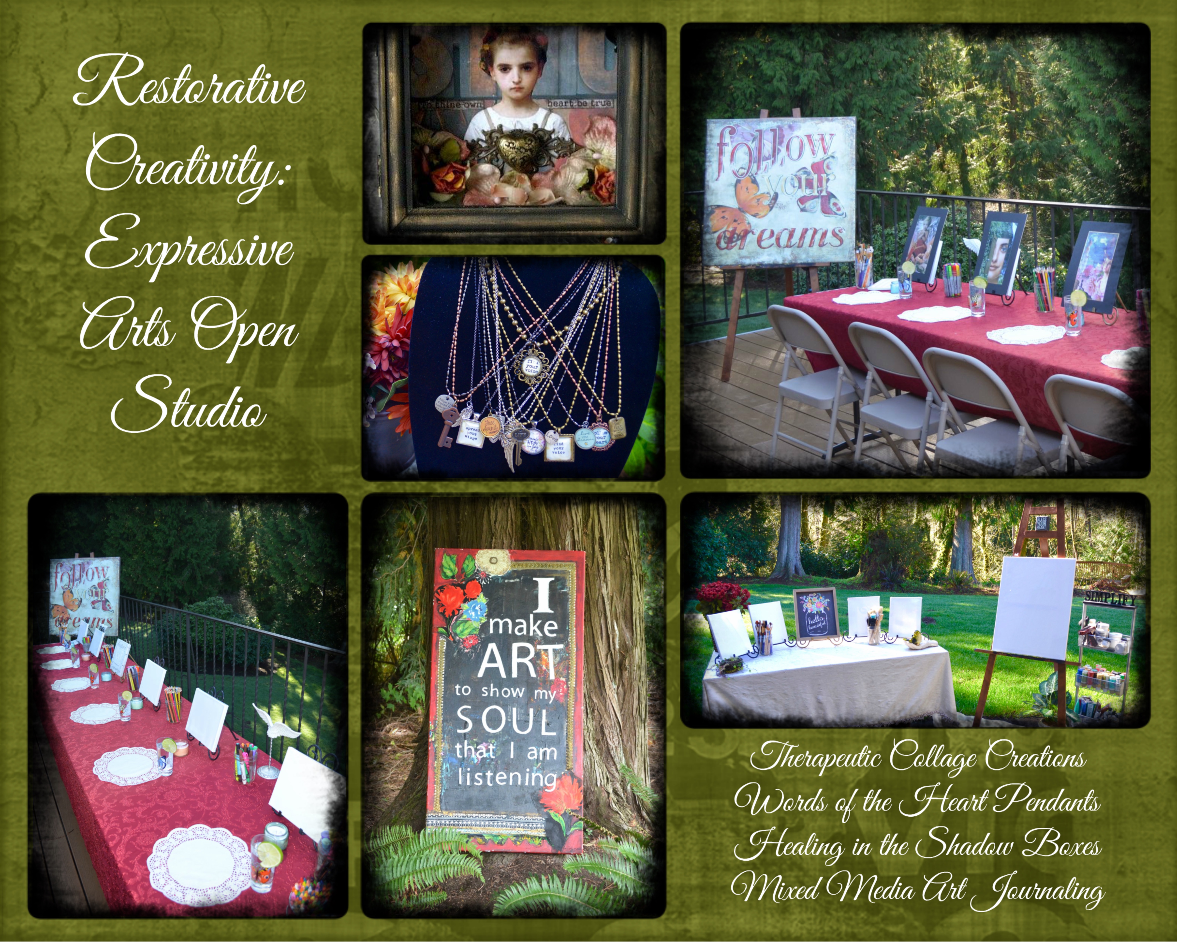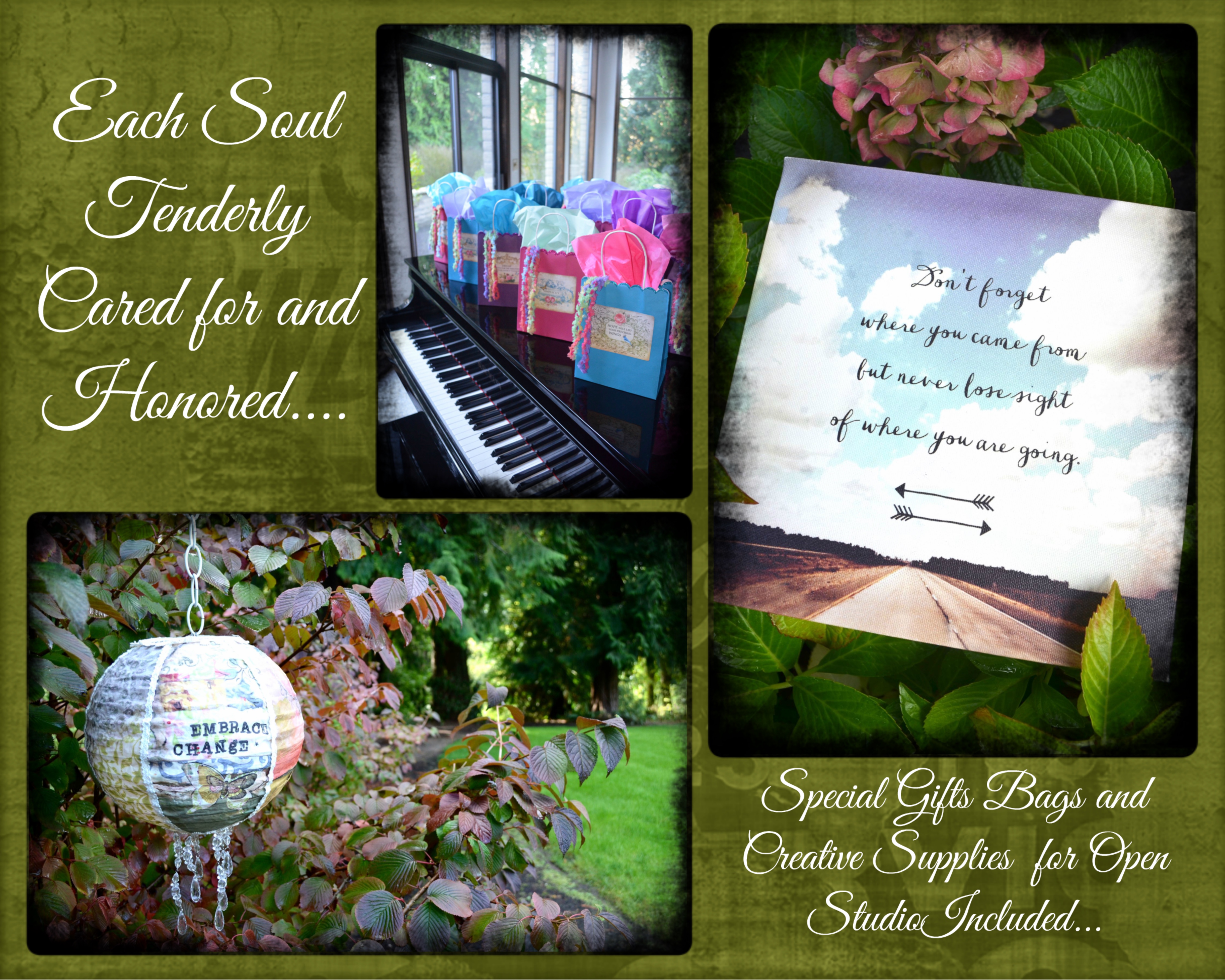 Throughout the retreat there will be several opportunities for attendees to participate in “Open Studio” exercises and projects if they choose. Therapeutic Arts Facilitator, Lani Kent will give simple instruction for exploring therapeutic collage, mixed media shadow boxes, personalized pendants and art journaling as a way to connect with the heart. There is no art experience necessary and all basic supplies for these projects are included in registration for the retreat!